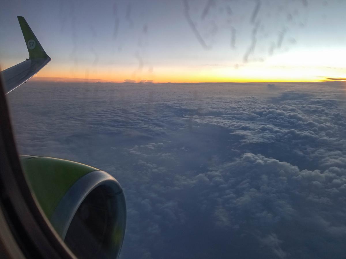 Взлететь должны были в 19:00. От стоянки оттолкались в 18:56, дорулили до полосы, постояли и… вернулись на перрон. Кому-то поплохело – вызвали медиков и болезного вывели. В 19:52 предприняли вторую попытку, на этот раз удачную – взлетели в 20:06, более чем с часовым опозданием.